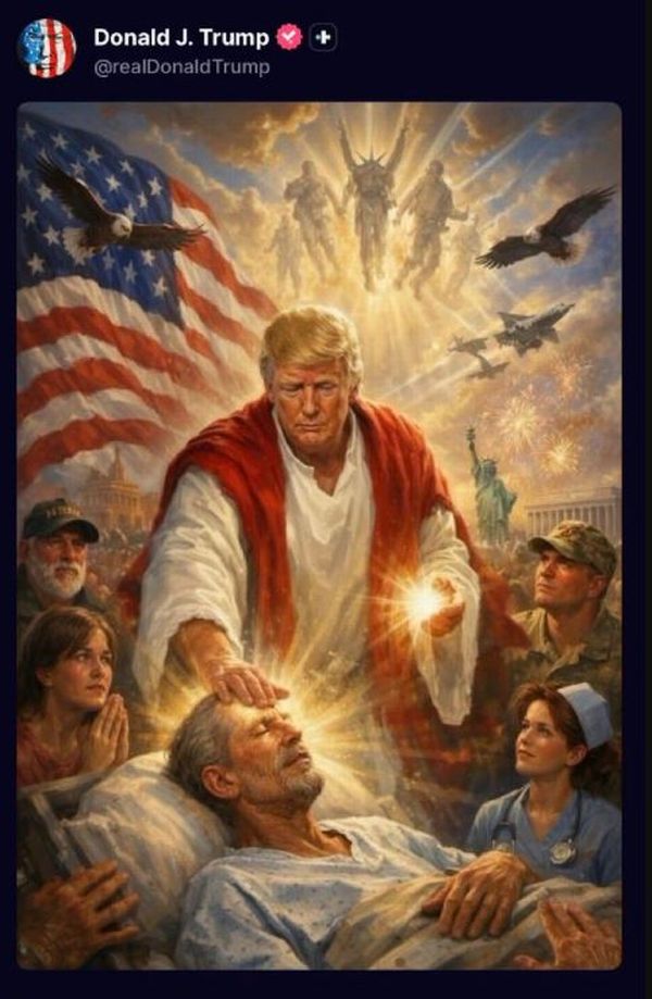 その画像は、自身をイエス・キリストのように描いたもので、両手から神聖な光が放たれ、病院のベッドで病に苦しむ男性を癒している様子が描かれていた。