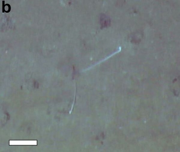 その生物は、新しいムチイカ(whiplash squid)の一種と考えられ、水管と2本の長い触手が海底から突き出ていたそうだ。